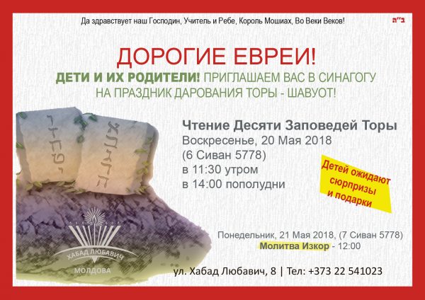 Приглашаем всех на чтение Десяти Заповедей Торы 20 Мая 2018 (6 Сиван 5778), Воскресенье Утром – в 11:30 После полудня – в 17:00 21 Мая 2018 (7 Сиван 5778), Понедельник Молитва Изкор – 12:00