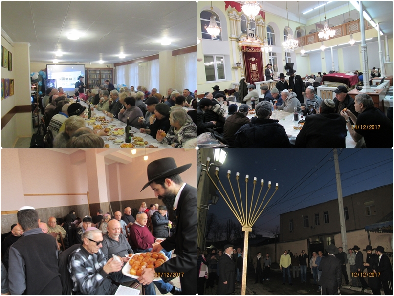 12 Декабря 2017 ( 24 Кислев 5778) Главный Раввин Молдовы и Кишинева Рав Йосеф Абельский зажег первую Ханукальную свечу в синагоге Хабад Любавич. В этот первый день Хануки синагога была полна прихожан. На улице при входе в синагогу также установили большую Ханукию. Все праздничные дни ярко горели свечи двух Ханукальных светильников. После зажигания все дружно пели гимн Анерот Алалу , танцевали и угощались пончиками, приготовленными на кухне синагоги.