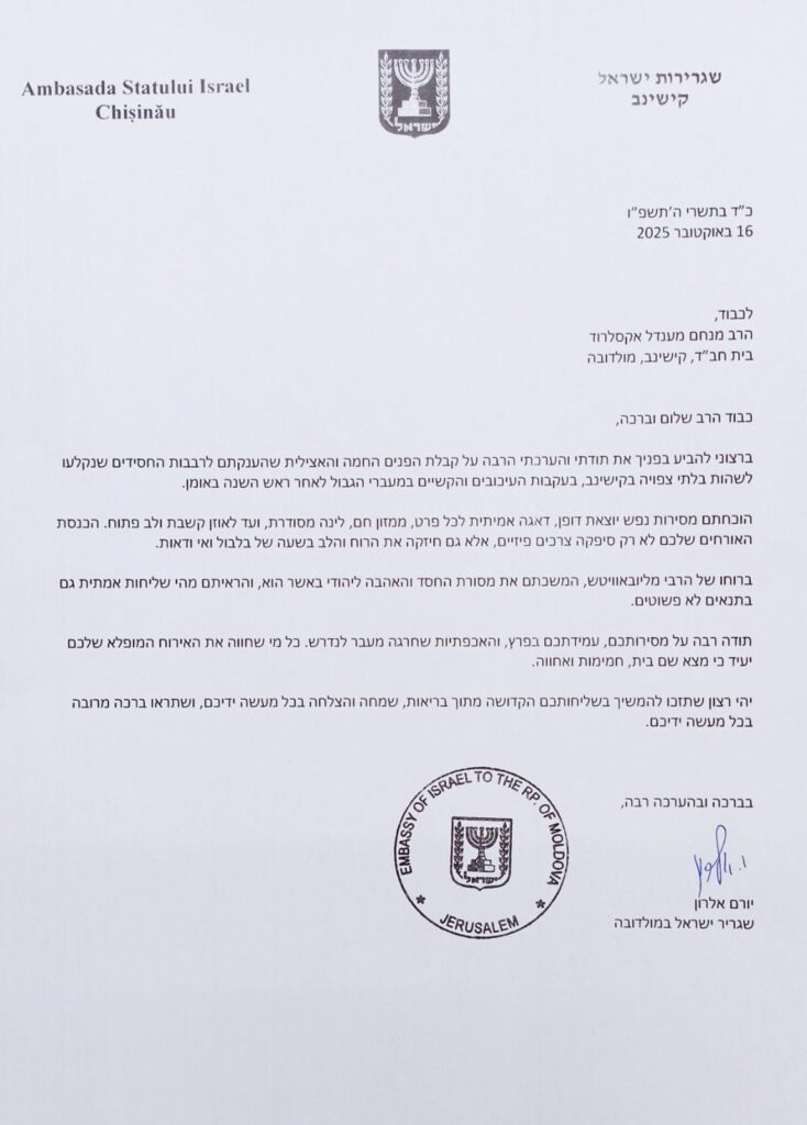 בשבוע שעבר קיבלה קהילת חב״ד במולדובה מכתב הוקרה מרגש, הממוען אל הרב מנחם מענדל אקסלרוד, רבה הראשי של מולדובה, מאת שגרירות ישראל בקישינב, החתום על ידי השגריר יורם אלרון.