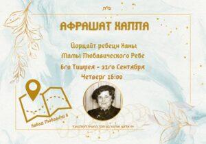 Приглашаем всех еврейских женщин на АФРАШАТ ХАЛА В честь Йорцайт ребецн Ханы Шнеерсон – Мамы Любавического Ребе Ждем вас 6го Тишрея – 21го Сентября (Четверг)