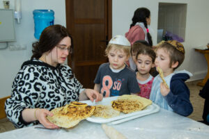В нашей синагоге недавно произошло особенное мероприятие для детей детского сада и учеников воскресной школы. В преддверии праздника Песах дети учились печь мацу. Ребецен Лея